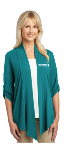 Top off your look in style with this shrug that’s equally flattering paired with a skirt or jeans. 4.4-ounce, 62/33/5 poly/rayon/spandex Button tab on sleeves Shawl collar Sloping front hem
